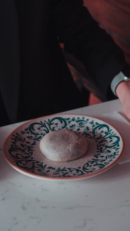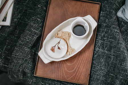 A piece of delicious Japanese confectionery on off white ceramic plate on wooden table. Selective focus.