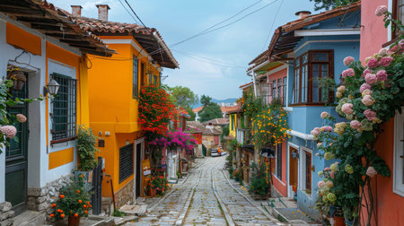 Charming view of a narrow cobblestone street lined with colorful, vibrant houses and abundant blooming flowers in an old city.