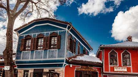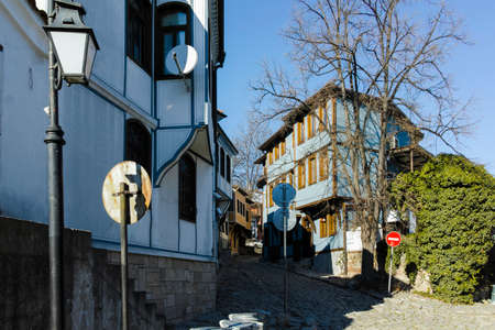 PLOVDIV, BULGARIA - JANUARY 2, 2022: Street and Nineteenth Century Houses in architectural and historical reserve The old town in city of Plovdiv, Bulgaria