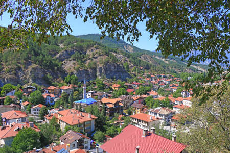 Historical old white small wooden houses of Mudurnu among mountains and trees.