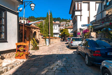OHRID, MACEDONIA - AUGUST 7, 2019 : View of the buildings in Ohrid streets in Republic of Macedonia. Ohrid is UNESCO cultural heritage site.
