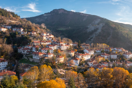 Historic Safranbolu houses set on a hillside with autumn colors and traditional architecture under a calm sky.