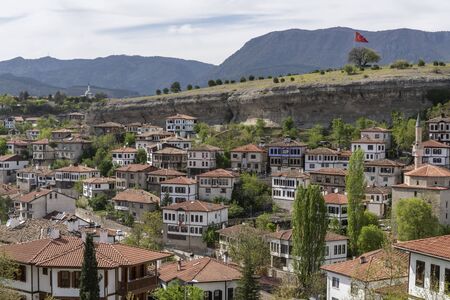 Safranbolu, Turkey - May 1, 2019: Touristic village with typical Turkish white houses and turkish flag.