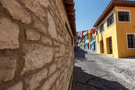 ESKISEHIR, TURKEY - APRIL 17, 2016 : General view of historical old colorful Odunpazari houses and pathway on blue sky background.