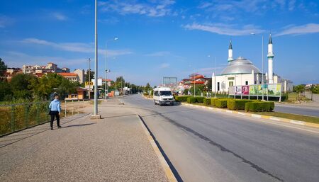 COLAKLI, TURKEY - NOVEMBER 05, 2019: Main road and Zekiye Oz Hatun Camii Mosque in Colakli town near Side city, Antalya region on the southern Mediterranean coast of Turkey.