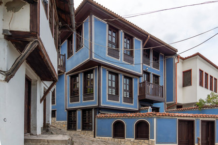 Traditional Kula houses with wooden structure in Turkish and Ottoman architectural style, Manisa, Türkiye. Historical buildings and houses on the streets of Manisa.