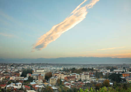 Telavi, Georgia - 6th novermber, 2022: Aerial scenic Telavi town rooftop panorama in autumn. Alazani Valley on sunset. The heart of Georgia's wine-growing regions