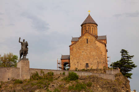 Metekhi church with David the Builder statue in Tbilisi, Georgia. An old Orthodox church on the banks of the Kura River