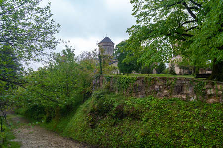 old restored temple of David the Builder Kutaisi 2014. before the temple there is a stone fence and high conifer
