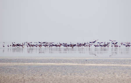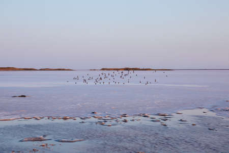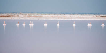 Seagull birds on sunset Genichesk pink extremely salty lake (colored by microalgae with crystalline salt depositions), Ukraine.