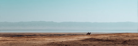 A lone horse rider moves through a vast, dry terrain near the coast, surrounded by distant mountain ranges and an expansive blue sky.