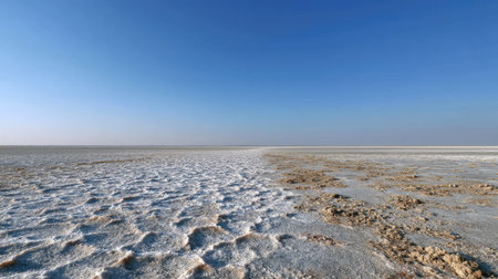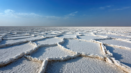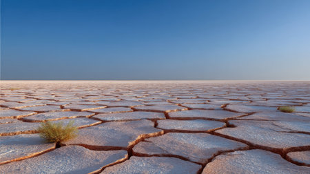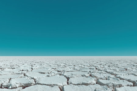 A stunning representation of a vast salt flat under a clear blue sky, showcasing intricate cracks and white salt formations in a unique and serene landscape.