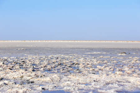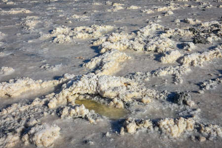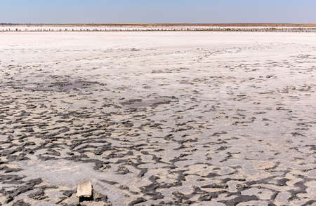 Landscape of a deserted salt lake. The texture of salt formations in the foreground. salt lake surface, dry salt lake, white salt lake