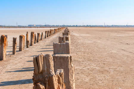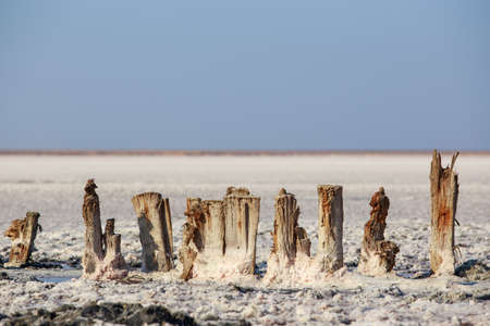 Petrified tree stubs on the bank of the salty lake, Kuyalnik, Ukraine. Global warming, climate change