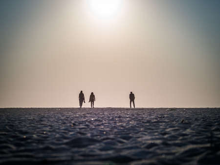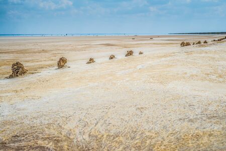 Sandy coastline of the salty lake Baskunchak. Lifeless hot terrain without vegetation and animals. Russia. Astrakhan region