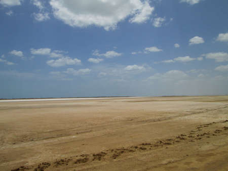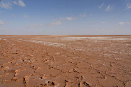 Dried salt lake Chott el Djerid in Tunisia. Desert around lake with blue sky without ghosts.