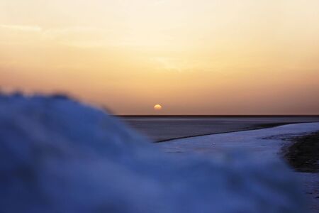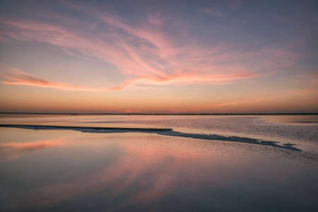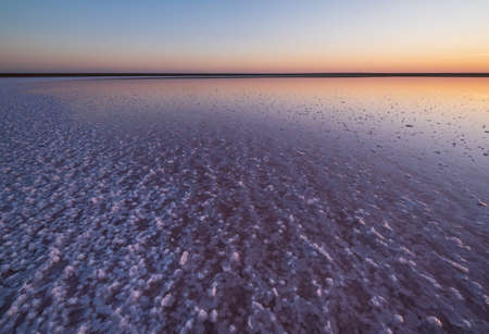 Sunset on the Genichesk pink extremely salty lake (colored by microalgae with crystalline salt depositions), Ukraine.