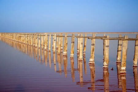 Wooden pillars in a pink lake. Perspective to the horizon. Pink lake water and clear blue sky