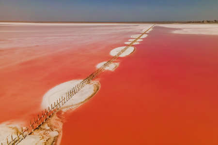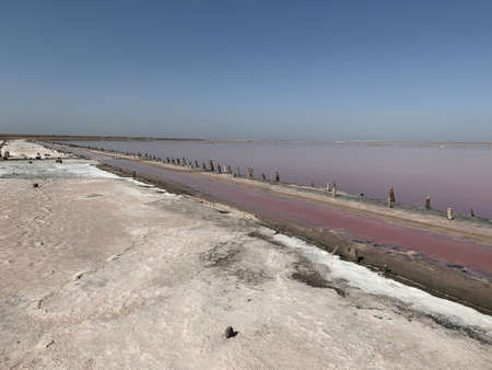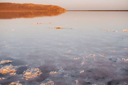 Brine and salt of a pink lake Koyash colored by microalgae Dunaliella salina, famous for its antioxidant properties, enriching water by beta-carotene, used in medicine and spa. cape Opuk, Kerch Crimea