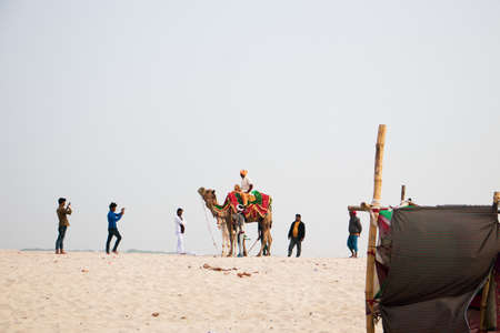 Unidentified people ride camels at Pushkar Camel Fair in Pushkar, Rajasthan, India.