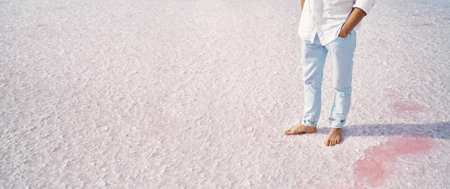 Panoramic image man legs barefoot standing on salt flats on pink salt lake, crystallized salt natural mineral formation. design banner with copy space
