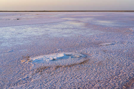Dried up the surface of the lake is covered with salt in the rays of the early dawn