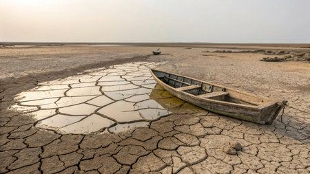 Boat in the arid, dry and cracked desert. Global warming concept.