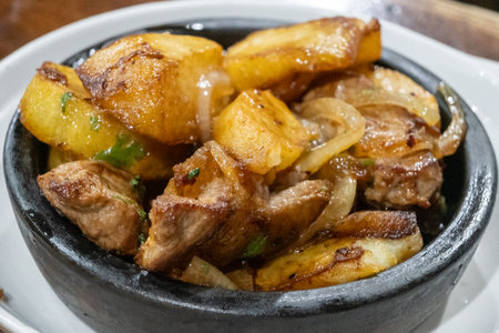 Ojakhuri served in ketsi, a traditional clay pan, features roasted meat and potatoes, with roots tracing back centuries in Georgian cuisine.