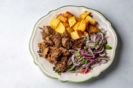 pieces of fried meat with onions and barley on a white plate next to lettuce.