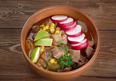 Pozole Рохо - traditional soup Mexico.broth rich soup made with pork, red chiles, radishes, cilantro
