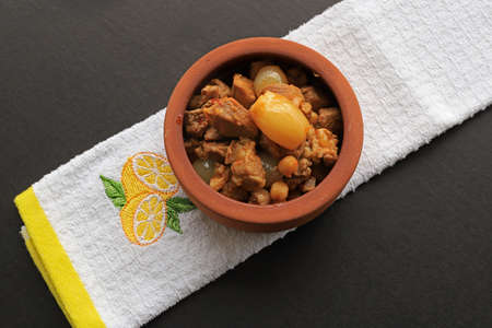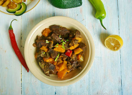 Guyanese, Pepperpot, meat stew, Caribbean cuisine, Traditional assorted dishes, Top view.