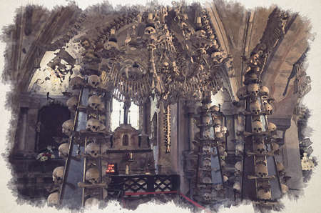 Watercolor drawing of Room with colonnade of human bones and skulls. Bony lustre hang rom ceiling. Altar with crucifixion of Jesus Christ in Kostnice Church