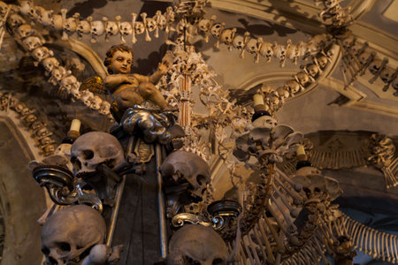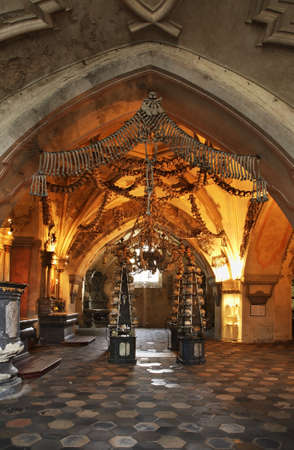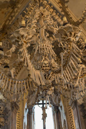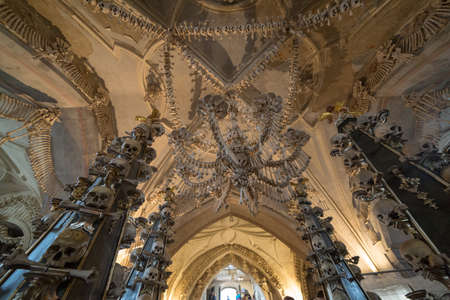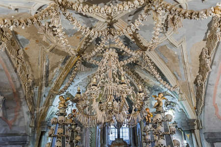 General view of Sedlec Ossuary, Church of Bones in Kutna Hora, designed by real human skeleton bones.