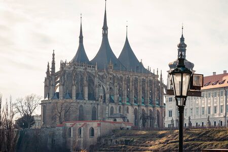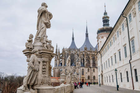 St. Barbara's Church, Unique gothic Cathedral and Former Jesuit College, gallery with baroque statues at Barborska street in winter, Kutna Hora, Central Bohemia, Czech Republic, January 23, 2021
