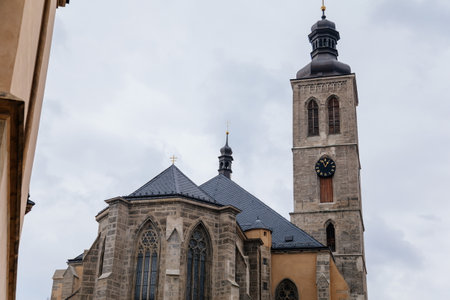 Kutna Hora, Central Bohemian, Czech Republic, 5 March 2022: Gothic stone Church of St. James or Kostel sv. Jakuba with bell and clock tower, medieval architecture at old town, lancet windows