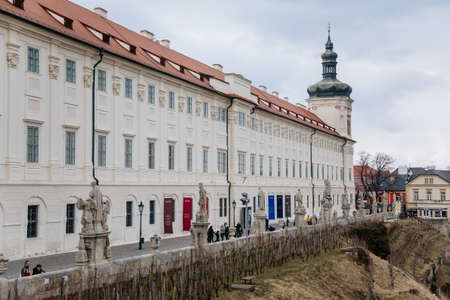 Kutna Hora, Central Bohemia, Czech Republic, 5 March 2022: Baroque Former Jesuit College with tower and dome, medieval architecture gothic and renaissance at old town, vineyards on a slope