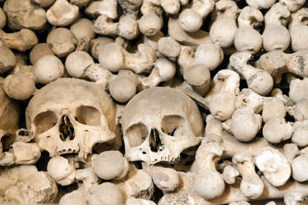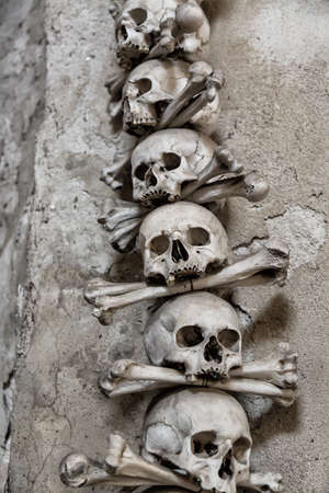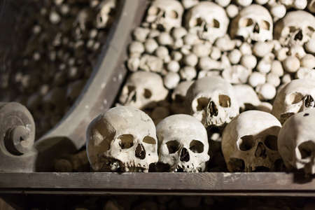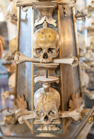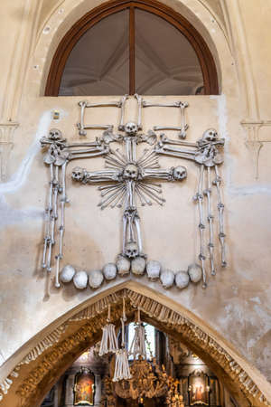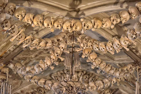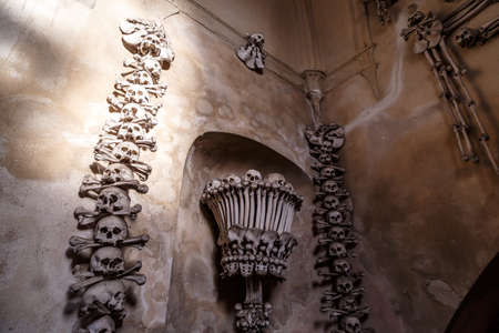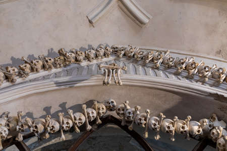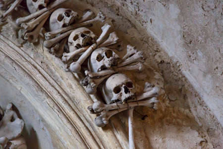 Human skulls and bones Kostnice Sedlec Ossuary, small Roman Catholic chapel, Cemetery Church of All Saints in Sedlec, a suburb of Kutna Hora in the Czech Republic. UNESCO world heritage site