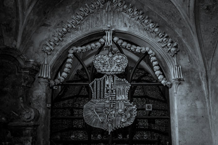 KUTNA HORA, CZECH REPUBLIC - OCTOBER 26, 2018: Detail of interior of Sedlec Ossuary, a small Roman Catholic chapel, located beneath the Cemetery Church of All Saints. Black and white.