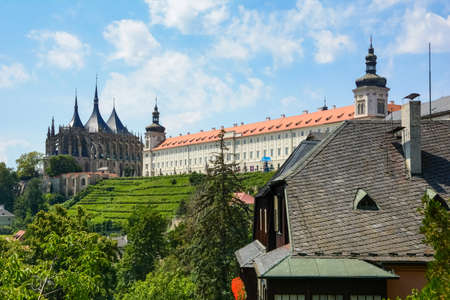 Kutna Hora, Czech Republic - 21 July, 2017: View of the Cathedral of St. Barbara, vineyards and Jesuit College.