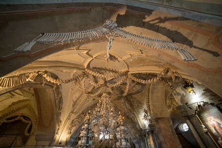 View of the Sedlec Ossuary interior detail. It contains the skeletons of between 40,000 and 70,000 people. Kutna Hora, Czech Republic - October 22 2019.