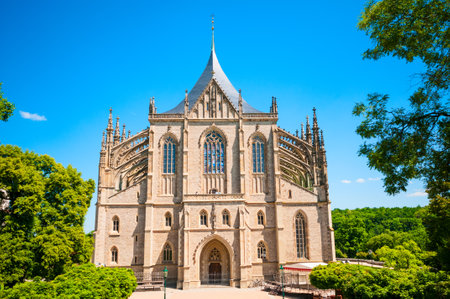 Gothic architecture of st. barbara s church facade with dramatic spires under blue sky.