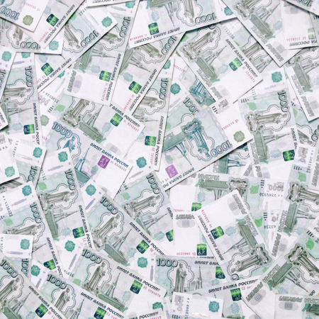 Background from Russian money, frame from many banknotes rubles, denomination 2000, copy space. Concept cash, salary, loan, wealth, credit, finance, business, deposit, insurance. Top view, flat lay.