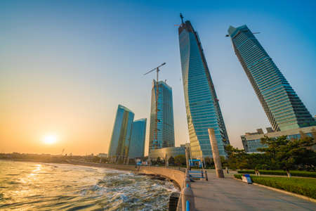 QINGDAO, CHINA - NOVEMBER 15: View of skyscrapers and city buildings along the waterfront during sunset on November 15, 2019 in Qingdao