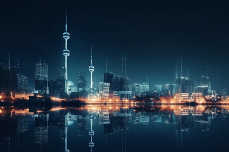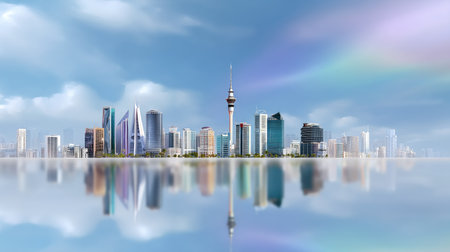 A picturesque city skyline reflects beautifully on calm water under a vibrant sky filled with clouds. This stunning view captures modern architecture and serene natural beauty.