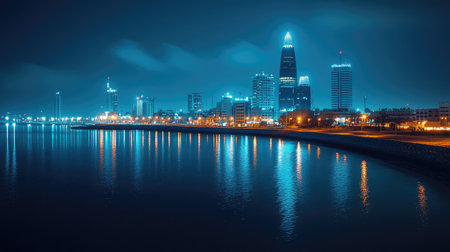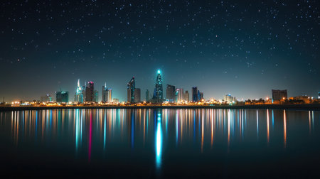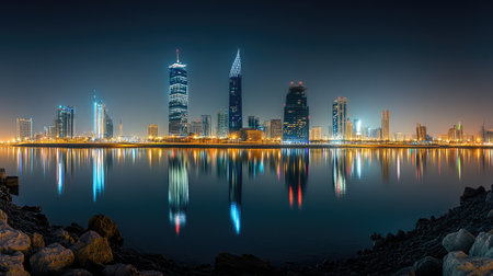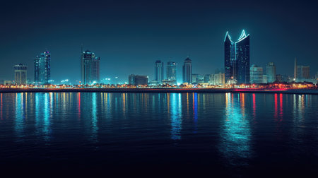 A serene night scene of Manama, Bahrain, with the city's lights glowing across Bahrain Bay, creating a tranquil and picturesque view.