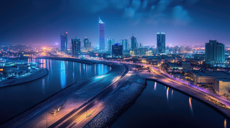 A stunning nighttime view of Manama, Bahrain, with the modern skyline glowing brightly along Bahrain Bay.