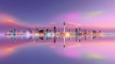 A breathtaking city skyline captured at sunset reflects beautifully on water, showcasing vibrant colors in the sky, ideal for travel and urban themes.