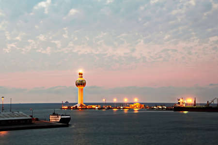 Night views of ships and berths in the port. Colorful views, the play of colors at sunset. Port Jeddah, Saudi Arabia. December, 2018