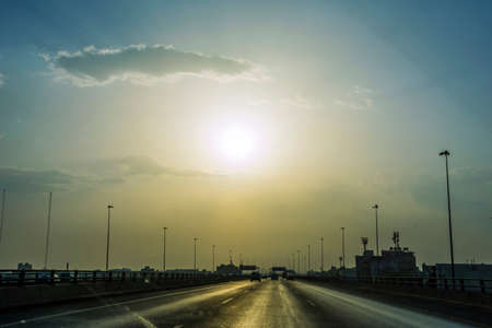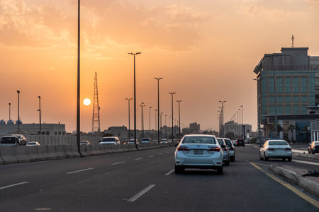 JEDDAH, SAUDI ARABIA - NOVEMBER 14, 2021: Sunset over a highway in Jeddah, Saudi Arabia