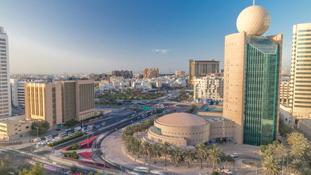 Top view of Kuwait cityscape during the sunset timelapse with modern skyscrapers reflected in water